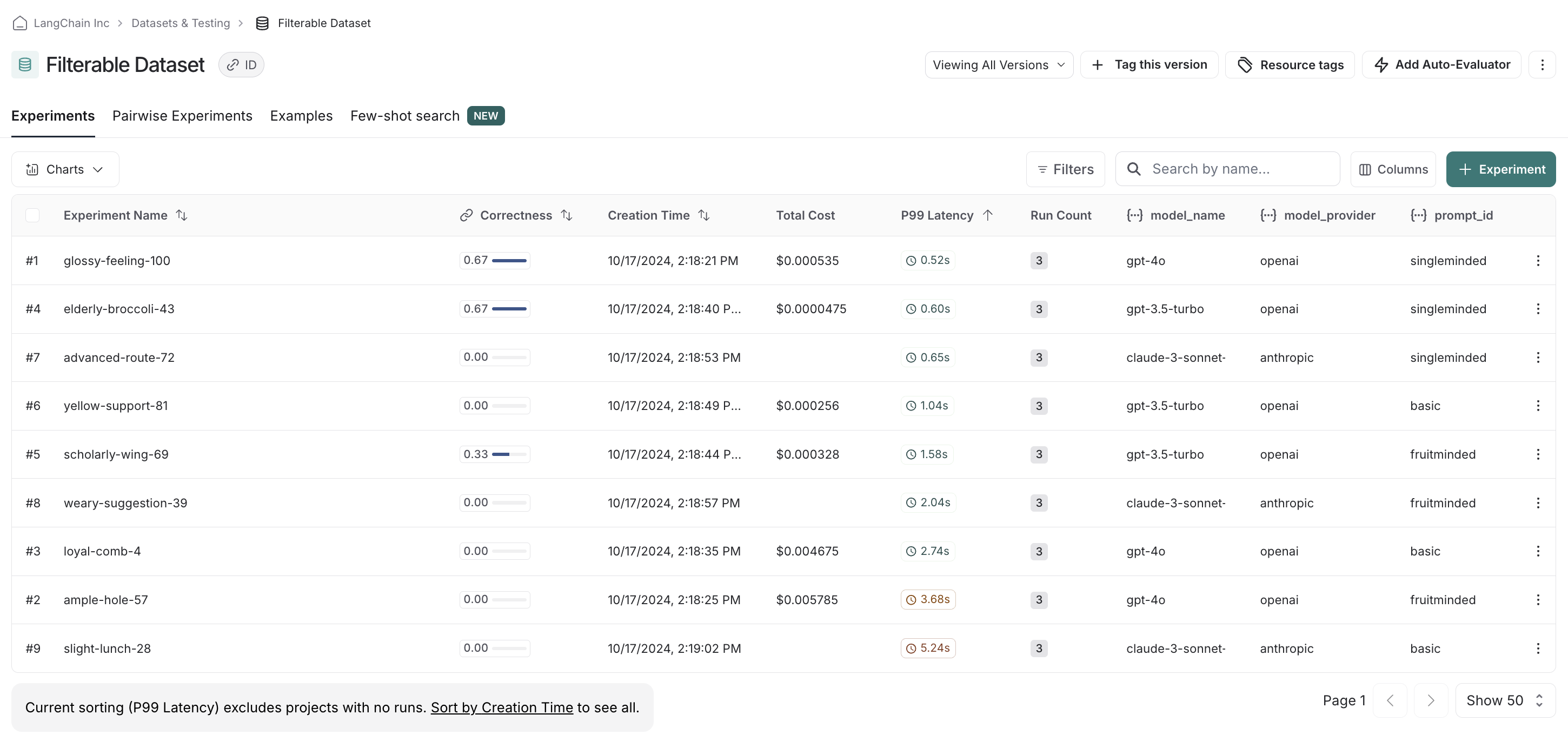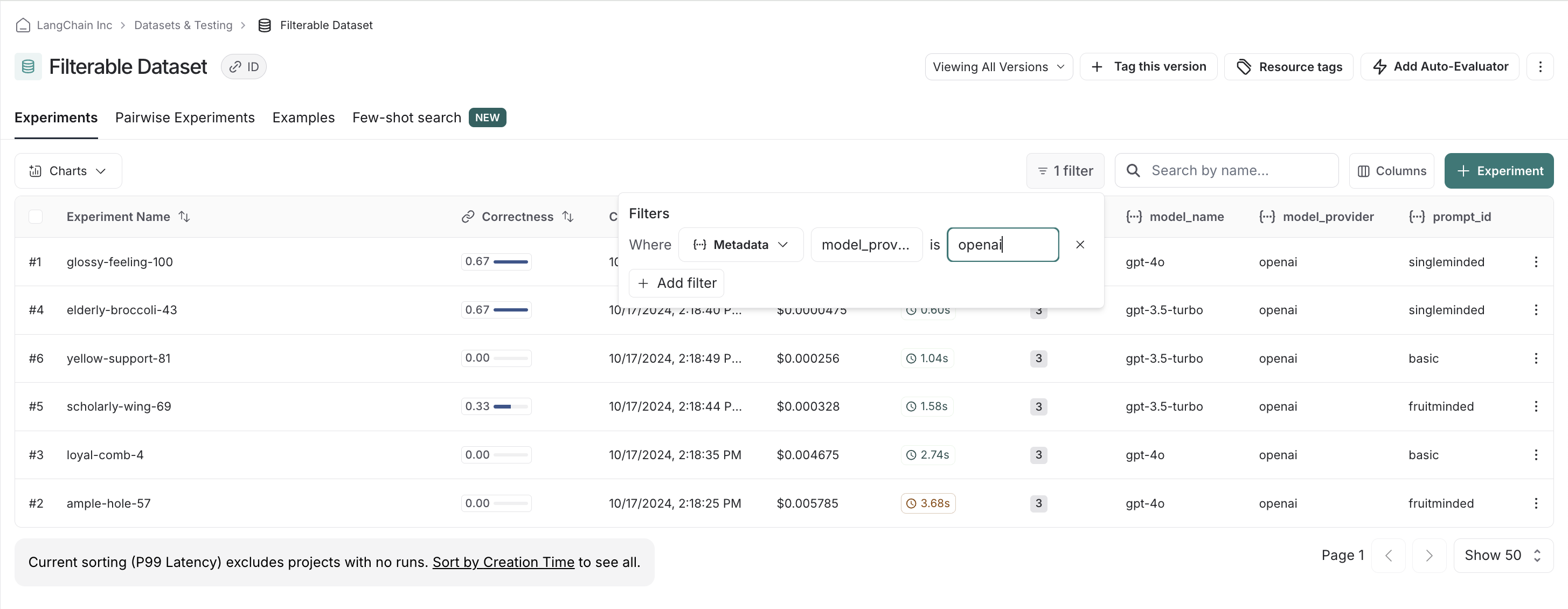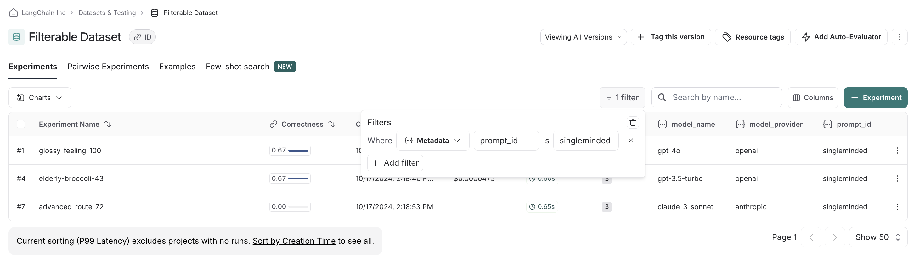 LangSmith lets you filter your previous experiments by feedback scores and metadata to make it easy to find only the experiments you care about.