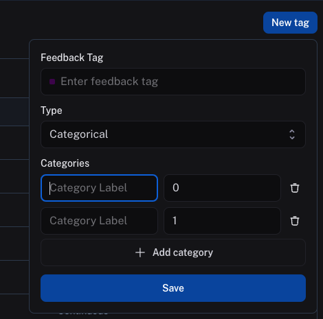 For categorical feedback, you can enter a feedback tag name, then add a list of categories, each category mapping to a score. When you provide feedback, you can select one of these categories as the feedback score. Both the category label and the score will be logged as feedback in value and score fields, respectively.