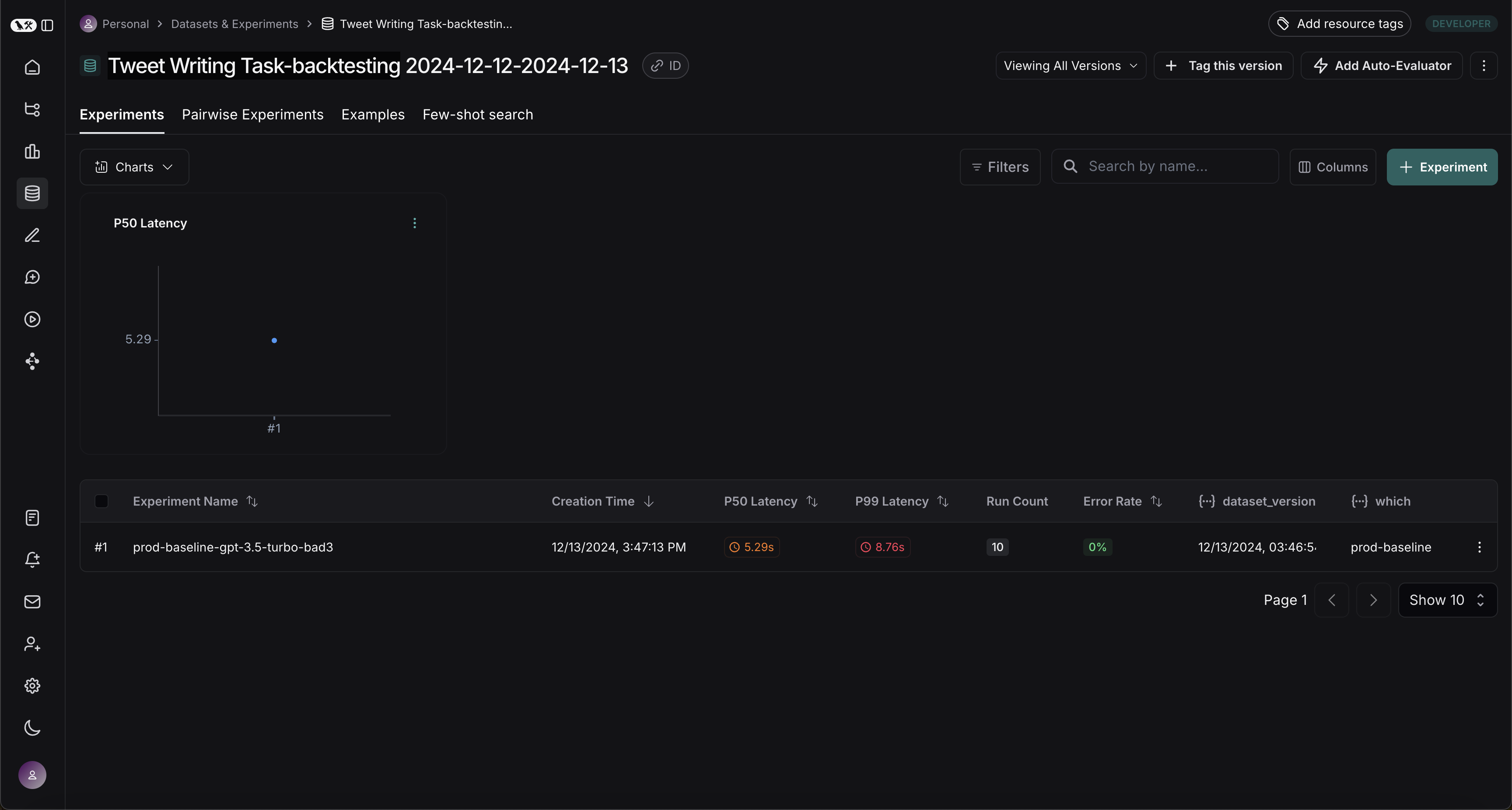 Once this step is complete, you should see a new dataset in your LangSmith project called "Tweet Writing Task-backtesting TODAYS DATE", with a single experiment like so: