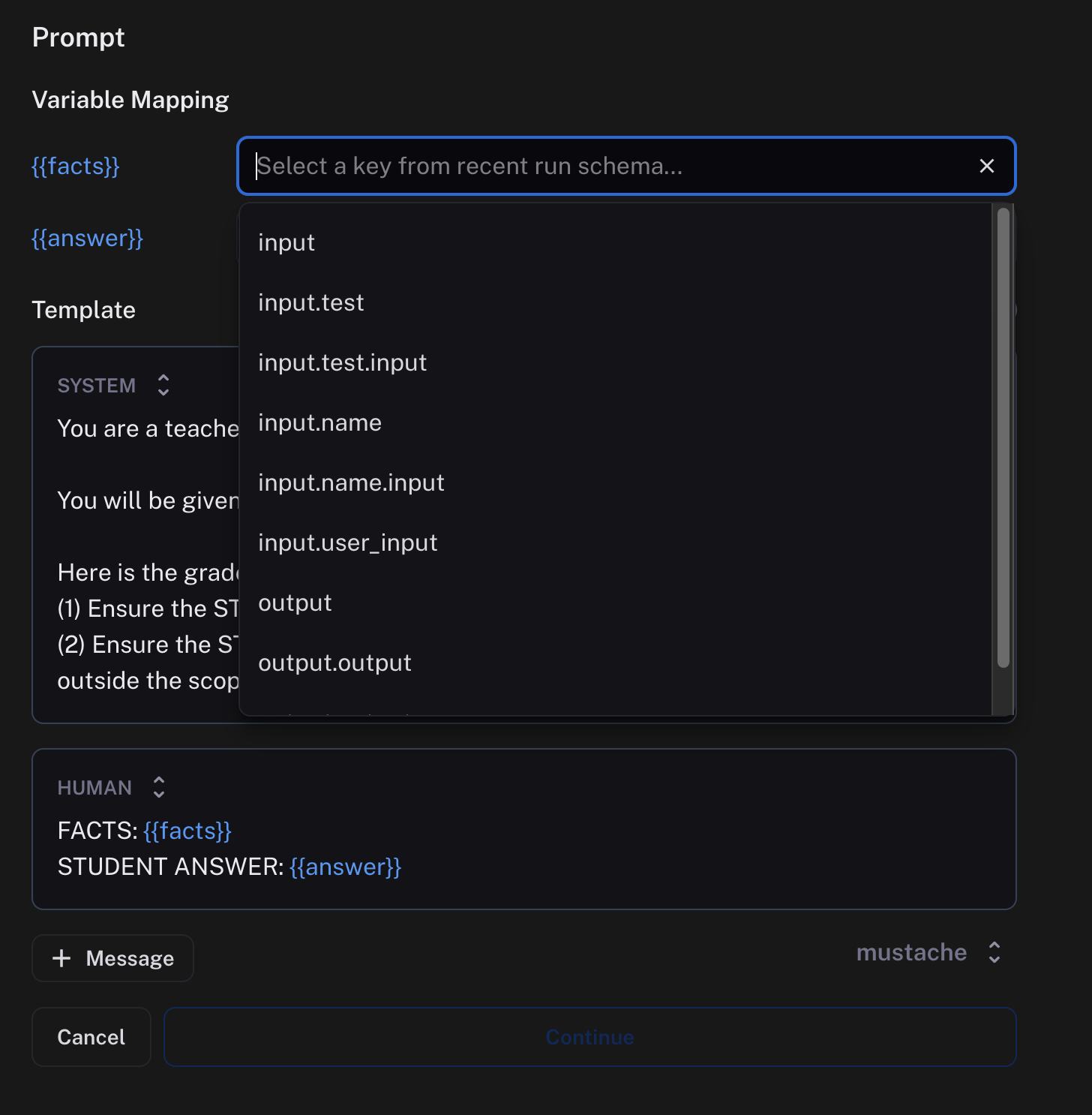 Prompts can be crafted with any variable name you choose. To map what is passed into your evaluator prompt from your runs or experiments, use the variable mapping inputs. There's a dropdown with suggestions provided based on the schema of your recent runs.