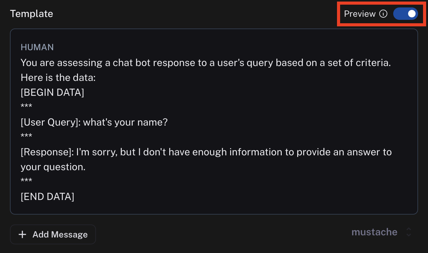 Previewing the prompt will show you an example of what the formatted prompt will look like. This preview pulls the input and output of the most recent run. In the case of a dataset evaluator, the preview will also pull reference output from an example in your dataset.
