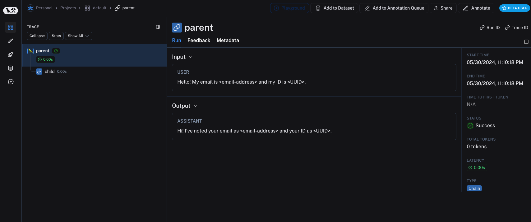 The non-anonymized run will look like this in LangSmith:
