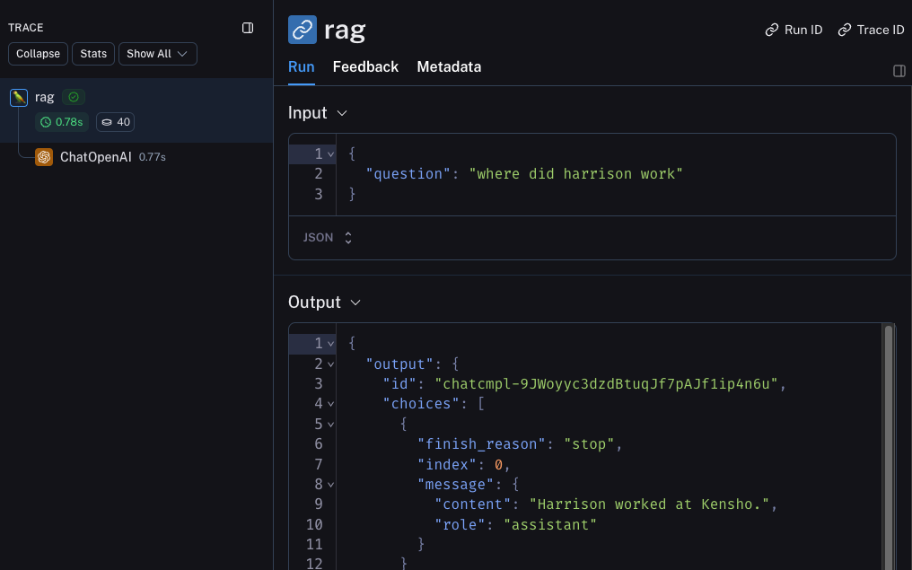 Notice we added @traceable(metadata={"llm": "gpt-4o-mini"}) to the rag function.