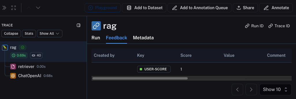Once the feedback is logged, you can then see it associated with each run by clicking into the Metadata tab when inspecting the run.