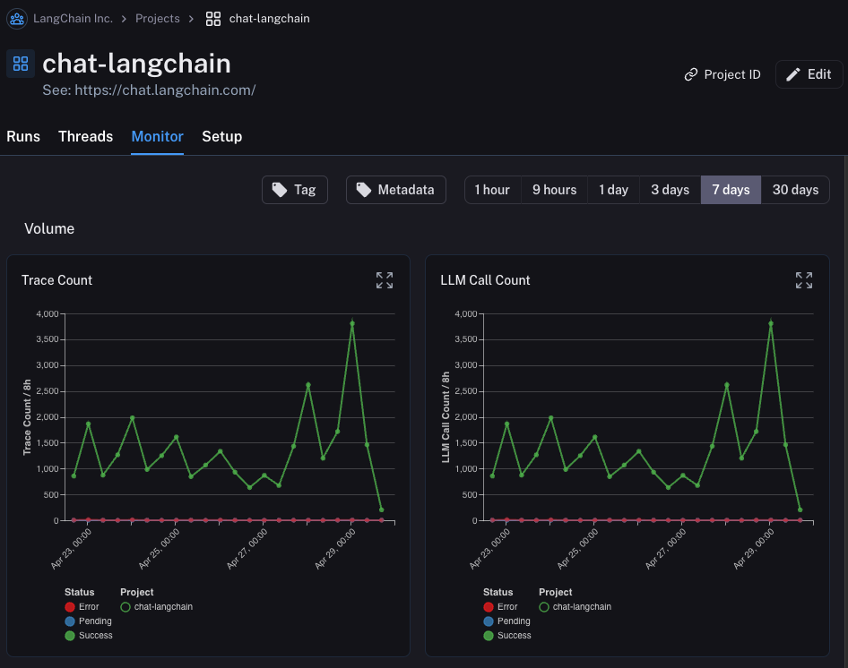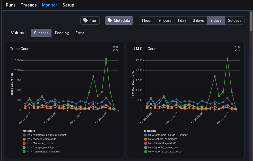 Here we track lots of LLM specific statistics - number of traces, feedback, time-to-first-token, etc.