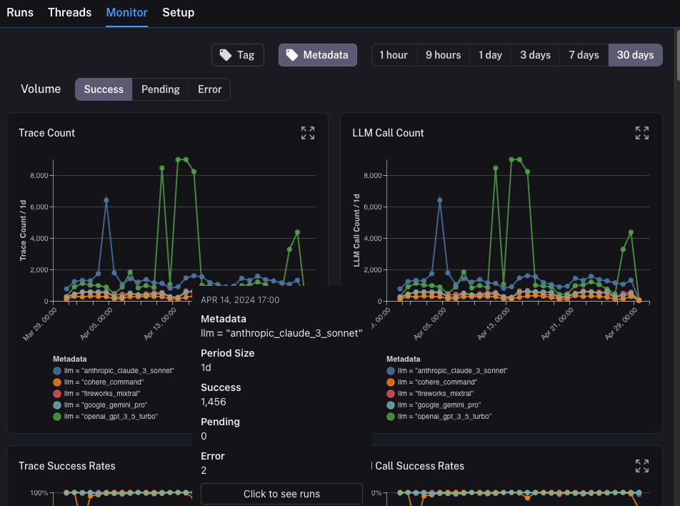 In production you likely have a LOT more traffic. So you don't really want to be stuck looking at datapoints one at a time. Luckily, LangSmith has a set of tools to help with observability in production.
