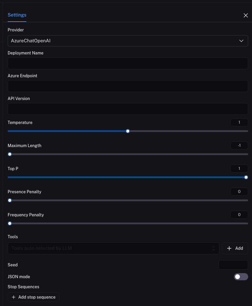 Once you have set these environment variables, enter the playground and select the AzureChatOpenAI model provider.
