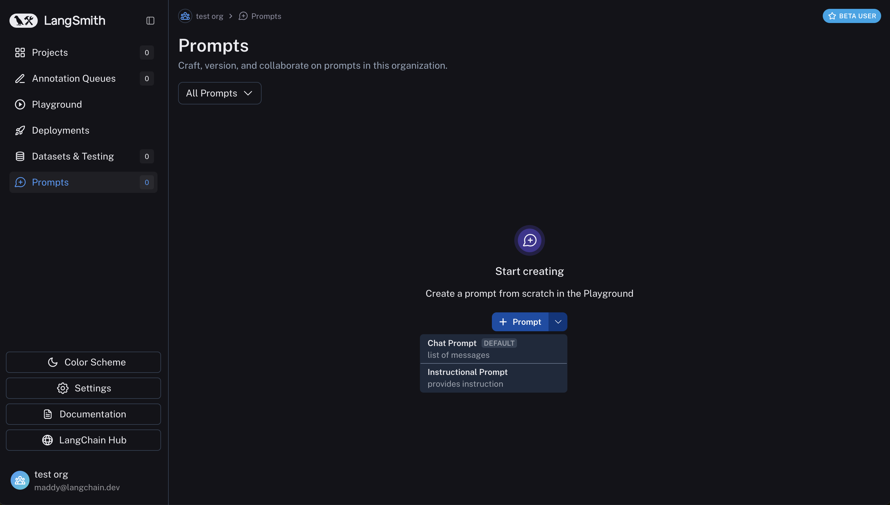 Navigate to the Prompts section in the left-hand sidebar or from the application homepage. Click the "+ Prompt" button to enter the Playground. The dropdown next to the button gives you a choice between a chat style prompt and an instructional prompt - chat is the default.