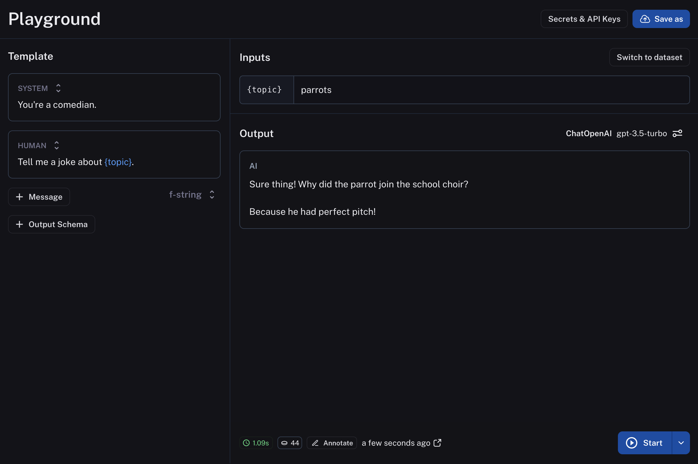 After choosing a prompt type, you're brought to the playground to develop your prompt. On the left is an editable view of the prompt. You can add more messages, change the template format (f-string or mustache), and add an output schema (which makes your prompt a StructuredPrompt type).