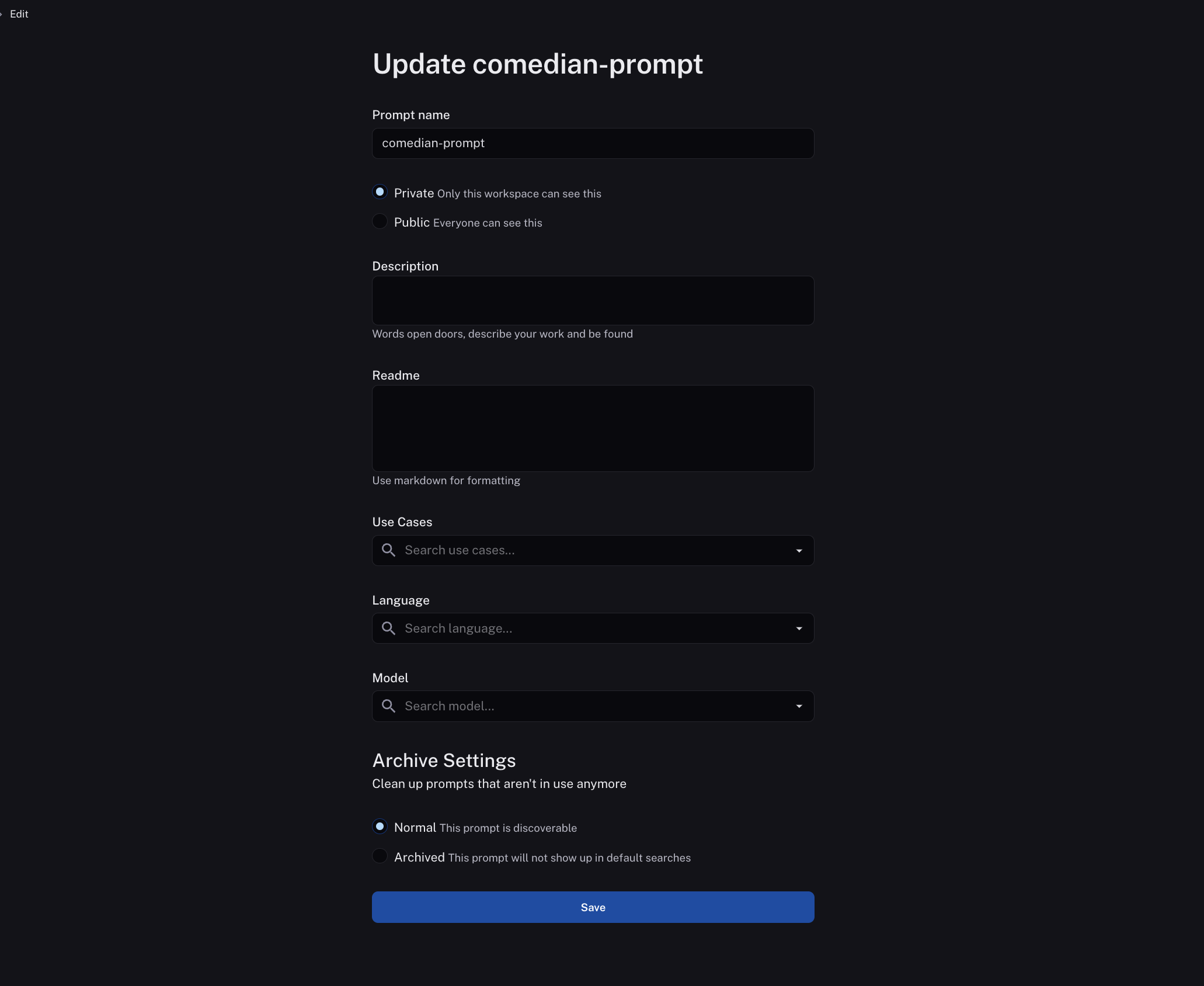 To add metadata to your prompt, click the prompt and then click the "Edit" pencil icon next to the name. This brings you to where you can add additional information about the prompt, including a description, a README, and use cases. For public prompts this information will be visible to anyone who views your prompt in the LangChain Hub.