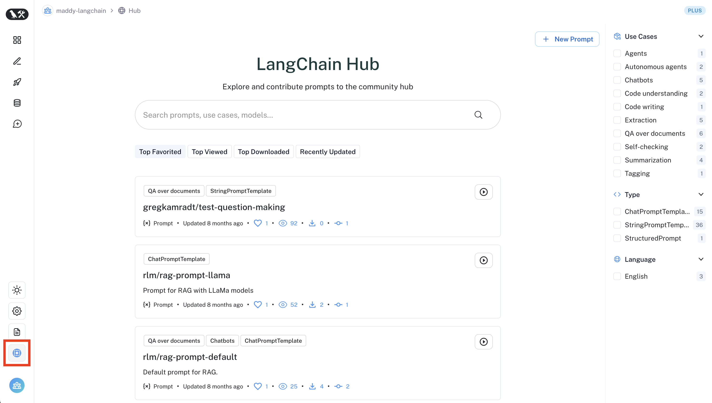 Navigate to the LangChain Hub section of the left-hand sidebar.